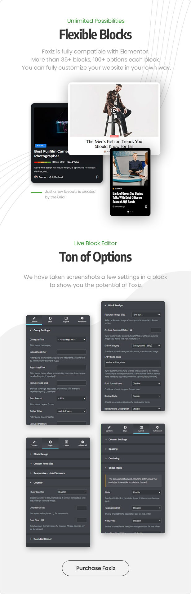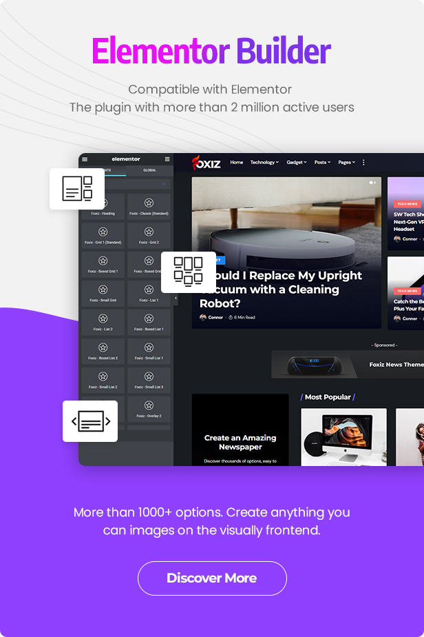 使用 Foxiz, 您可以创建令人惊叹且复杂的布局, 而无需触及任何一行代码. 所有演示都是使用 Elementor 构建的, 展示了该插件的灵活性和强大功能. 此外, 该主题还附带自己的 Elementor Flex 块, 可让您进一步增强网站的设计和功能.